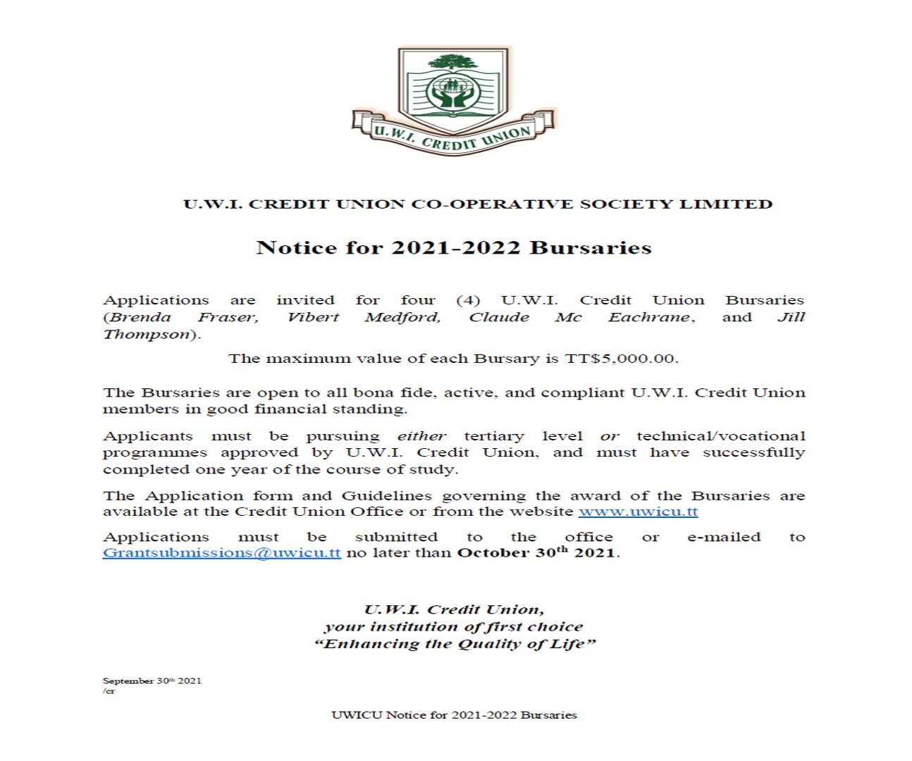 UWICU ICU DAY 2021 PRESIDENT’S ADDRESS & INTERNATIONAL CREDIT UNION 2021 INITIATIVES SCHEDULE